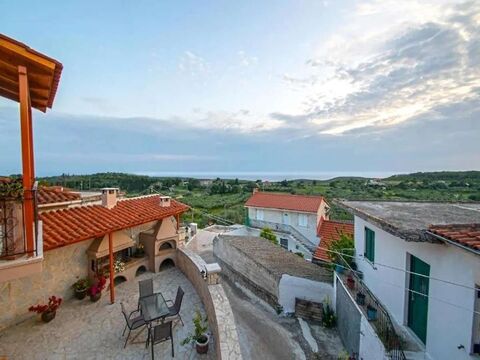 Detached house fully furnished with an area 160sqms in mountainous Zakynthos, with amazing sea view and fantastic sunset, for sale. The detached house includes 2 separates apartments of 80sqms each. The ground floor includes living room with fireplace, kitchen, 2 big bedrooms, 1 big bathroom and big verandas with amazing view to the sunset. The A' floor has a different outside entrance and includes very big living room, kitchen, bathroom, 1 bedroom and verandas with amazing view. It is located in a plot of 300sqms and it has 2 parking spaces (one of them in close garage), water tank, wooden traditional windows, fire place, air condition, stone fence, ware house. Distances: 27km from the city, 4km from the sea and 100 meters from stores.