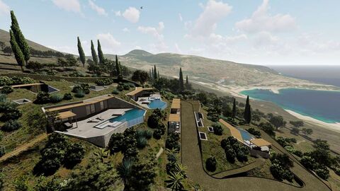 Panoramic plot of land with an area of 4,200 sq m in Volimes, Zakynthos, 100 meters from the sea with a fantastic view of the port of Agios Nikolaos, for sale. The plot is suitable for building 186sqm residences or 3 luxury cave villas with private swimming pools with a total building area of 360sqm. Distances: 38 km from the city, 250 meters from the shops and the sea.