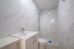 The bedroom is a sanctuary of calm and comfort. Expansive windows flood the room with natural light, while the well-balanced proportions leave space for both a cozy bed and a practical built-in wardrobe. The soft tones of the walls and floors create a neutral canvas, giving you full freedom to design your own atmosphere — whether you lean toward soothing pastels or bold accents is entirely up to you. In the bathroom, designers continued the theme of understated elegance: large-format ceramic tiles with a natural texture, black fixtures, a spacious walk-in shower enclosed in glass, and a softly illuminated mirror. This isn't just a bathroom — it's a private retreat, a place where every day starts with a sense of ease and refreshment.