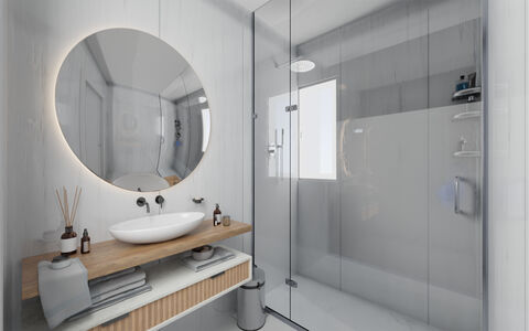 When it's time to unwind, retreat to the spa-like bathroom. The sleek, contemporary design, with its high-end fixtures, creates a haven of peace and tranquility. The spacious shower, elegant vanity, and ambient lighting invite you to shed the day's worries and simply be.