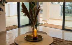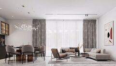 Inside the apartment, light becomes an active part of the design. The open-plan layout doesn't create borders, but transitions—allowing the living room and kitchen to merge into one cohesive space where air and light move freely. Soft hues on the walls, wooden floors, and linen-like textures speak not of extravagance, but of cultivated taste. Simplicity here is not economical — it's elegant. Floor-to-ceiling windows open onto Limassol's skyline, which appears not as a cityscape but as a scenic panorama—complete with morning mist and the warm blush of evening sunsets.