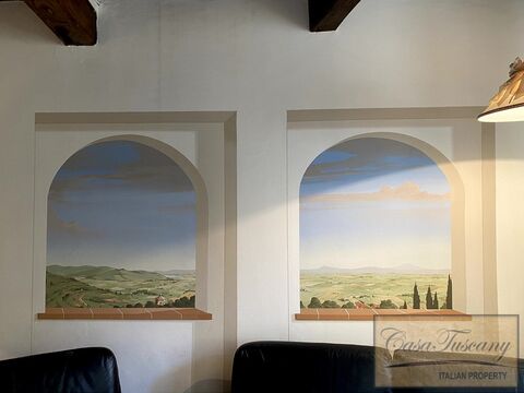 On the ground floor there is a large living room with frescoes and a stone fireplace and, through two arches, you pass in to the kitchen. On the same floor there is a bathroom and a small laundry room.