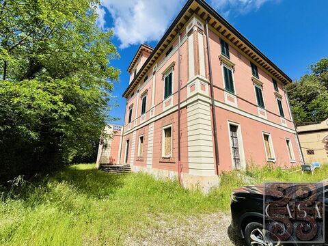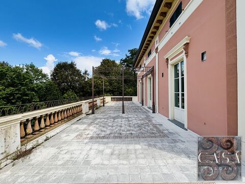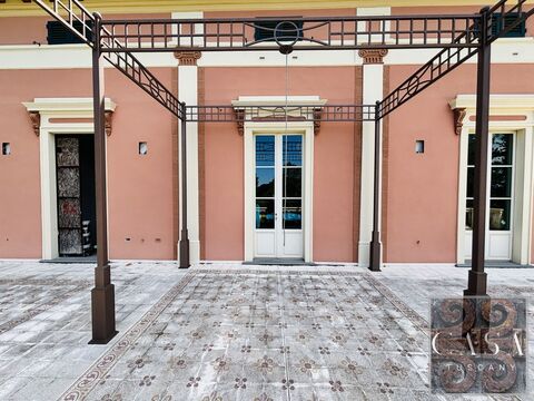 Located between Pisa and Lucca, a prestigious villa, partly restored with high-end materials and interiors designed by a London studio, with a total floor area of over 800 sqm + 260 sqm of storage rooms, set in 5 hectares of land with fruit trees, olive trees and wood.