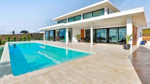This modern home is spread across three spacious floors and features plenty of glass windows that let in ample warm Portuguese sunshine. The ground floor of the villa comprises a lovely open-plan living room, dining area, and kitchen that overlooks the inviting pool. The ground floor also features two en-suite bedrooms.