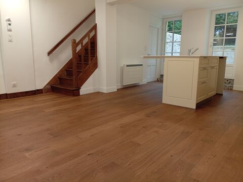 Sejour/salle a manger/cuisine - 35m2 pas une forme conventionnelle comme toutes les pieces de cette maison ; avec des sols en chene, des elements de cuisine sur mesure avec des produits blancs installes, des fenetres a l'avant de la maison et deux portes vers l'espace exterieur prive a l'arriere de la maison.