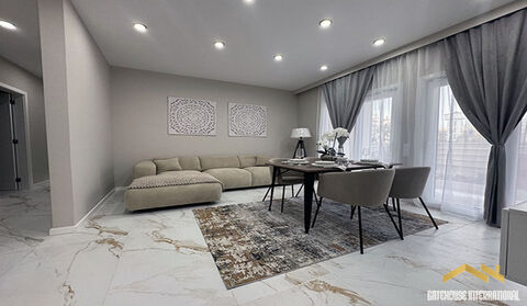 T2 Ground Floor Beach Apartment in Lunamar Armacao de Pera Algarve - in the top right-hand corner, there is a dining area with a table and chairs, next to which is a kitchen, equipped with a fridge, cooker and sink. Below the kitchen is a bathroom with a shower, toilet and sink. To the left of the bathroom is a bedroom with a bed and built-in wardrobes. in the centre of the floor plan is the living room area, with a corner sofa and armchair, facing what could be a fireplace or entertainment centre. There is another room to the left of the living room that could be another bedroom or office space; however, the designated use is not marked. in addition, there are outdoor spaces such as a balcony or terrace indicated by dotted lines. The layout suggests a comfortable, functional living space with a contemporary design. in brief: - living room - dining area - kitchen - 2 bedrooms - 2 bathrooms - balcony - terrace - underground parking space Pera is a peaceful village situated in the municipality of Silves. Strolling through the peaceful village, you will find the main street, very narrow like a funnel, the Church of Sao Francisco de Pera and Barrocal, a place to rest, write and see the sea. The main attraction is undoubtedly the beach Armacao de Pera, which is one of the largest sandy beaches in the Algarve, located within 5 km of the centre of the village. There are also cafes with terraces, shops and restaurants along the entire beach, as well as the pedestrian promenade. Pera is located within an approximately 40-minute drive from Faro airport, 12 minutes from the Guia Shopping Centre and from the famous family theme park Zoomarine.