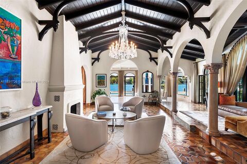 El Escape an Italian Villa nestled within the lush Venetian Islands features stunning, original architectural details and panoramic vistas of Biscayne Bay from every angle! Step inside to discover majestic living spaces with soaring cathedral-beamed ceilings, oversized arched windows and doorways, fireplace, and original Arabesque tile floors. Oversized primary suite with modern bath, gourmet kitchen, family room, 3 beds in main house, secret room , guesthouse, and a 2-car garage awaiting discovery! Enjoy the tropical scenery of Venetian Islands and glistening water views from your secluded backyard! This home is a hidden tropical retreat offering a sanctuary for relaxation and entertainment, and ideal central location with access to all the wonders of Miami s vibrant landscape.