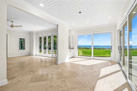 Tropical Oceanfront Luxury!Set on over an acre of private and direct oceanfront, this extraordinary residence in Village Shoresa unique and gated enclave of just 20 homes in the heart of Indian River Shoreshas been beautifully transformed for todays coastal lifestyle. A gorgeous winding travertine driveway leads to a 3-car air-conditioned garage and a tropical paradise of lush landscaping, sweeping lawns, and a pool overlooking the Atlantic. Inside, the home offers 5 bedrooms, 6 full baths, an oceanfront office, and a versatile flex room. Elegant natural stone and oak flooring, refined finishes, and walls of glass frame uninterrupted beach and ocean views. The chefs kitchen, reimagined with Sub-Zero, Wolf appliances, and dolomite countertops with a leather finish, flows seamlessly into inviting living and dining spaces designed for both entertaining and quiet retreats. Every detail reflects thoughtful updatingfrom limestone baths and marble vanities to refined lighting, custom
