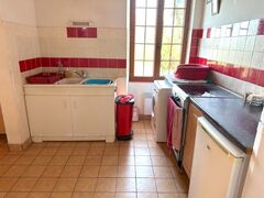 Ground (2 steps) = Entrance into 18 m2 fitted kitchen (hob, extractor fan, oven, sink, fridge) + 13.5 m2 sitting room with access to balcony + 3.3 m2 shower room (WC, washbasin, shower).