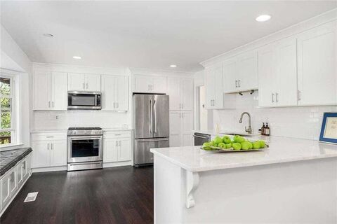 There is nothing ordinary about this custom-built home, where timeless elegance meets modern comfort. A grand round entry foyer, reminiscent of a Florentine castle, sets the stage for the dramatic vaulted great room, seamlessly flowing into the dining area, kitchen, and terrace-level rec/media room. Designed for both entertaining and everyday living, the open-concept layout offers generous space and architectural charm. The main level features three spacious bedrooms and two beautifully updated bathrooms, while the terrace level boasts a versatile rec/media room with a full bar, an additional bedroom, powder bath, and a dedicated laundry room. Enjoy multiple outdoor living spaces, including a screened porch, deck, and patio, perfect for relaxation. Conveniently located within walking or biking distance to Leslie Beach Club (swim & tennis) and just minutes from Emory University, this home is a rare blend of character, comfort, and convenience. No HOA.
