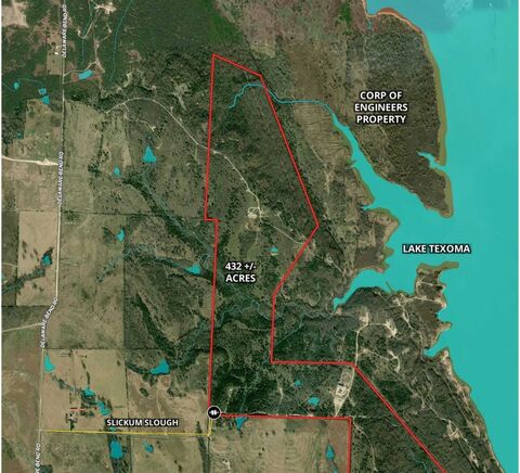 Recreational dream property adjoining Lake Texoma! Hunting, fishing, four wheeling or just relaxing are all possible on this 432 acre property. This very unique property adjoins the Corps of Engineers land on Lake Texoma. There are approximately 3 miles of Corps frontage adjoining over 700 acres between you and the Lake. The terrain is varied with elevation changes of 145 feet with the highest at 775 feet. There are 3 ponds, several creeks, open grazing areas, and a large blanket of hardwood trees. Northern Grayson County is known for its Whitetail deer and Lake Texoma for its Striper fishing. Wildlife hunting and fishing can be nothing less than exceptional! It has one entry at Slickum Slough and is fenced for cattle. This property is a rare find as there are no other properties on the market that adjoin Lake Texoma with this amount of acreage. There are active oil and gas leases in place on the property. Minerals do not covey but could be negotiated.