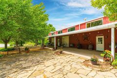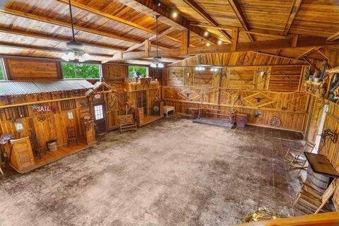 The Longhorn Hill Ranch Venue is a true getaway and a perfect place to raise a family, enjoy the ranch life, or escape the city. This barndominium features vaulted beamed ceilings, 2 huge doors can open for an outdoor experience. Trimmed w cedar wood for unique designs & themes. The 2 front facades that says Jail on one and the other is a porch look will move over on rollers to provide an outdoor opening for a party to flow indoor and outdoors. The structure provides a rustic western atmosphere. The upstairs has living accommodations and a balcony overlooking the Ball Room. 2 bedrooms, Full kitchen,3 baths, ( 1 full bath up and 2 down) storage room. Less than 1 hour from downtown Dallas and DFW airport, this sprawling 63-acre Ranch offers large trees, a 32-acre lake ( owned by sellers and In soil and water conservation), a gazebo, lush pastures, This property is perfect for equine lovers. The Structure and gazebo are located near the lake to make a beautiful setting for weddings, c