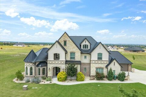 Extraordinary European Country inspired home in one of the most desirable additions in Aledo -- La Madera Estates! Superbly built with perfect blend of sophisticated yet livable style and appointed from head-to-toe with gorgeous finishes and state-of-the-art amenities including TESLA Powerwall Backup Power Grid plus Class 4 rated TESLA Solar Roof Tiles ultra energy efficient and arguably the most impressive feature of the home! Bright and open design chef's kitchen with SS commercial grade appliances, 6 burner cooktop and double ovens. The kitchen opens to impressive great room with high ceilings, impressive floor to ceiling stone fireplace, gleaming hardwood floors and great windows overlooking it's incredible resort-like backyard! Fabulous outdoor pool cabana with built-in BBQ grill and outdoor kitchen and living space overlooking a stunningly sleek pool with Pentair LED color lighting, pristine landscaping and gorgeous views of serene lake and pretty estate properties all around!