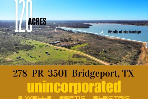 120 acres of open land ready for personal development, subdivision, or investment. Nestled just 45 minutes from Ft Worth, conveniently 1mile from Bridgeport Municipal Airport & 2 miles from Runaway Bay Marina Golf Club & Resort this gem boasts a half mile ofLake Front & quarter mile of Highway Frontage. Man made canal can allow developers to provide multiple lots with water accessto Lake Bridgeport!