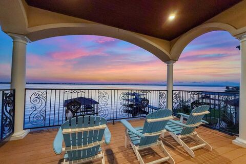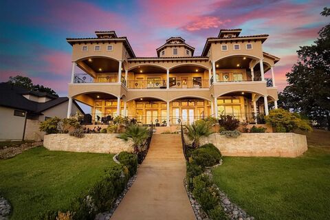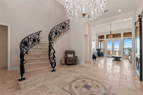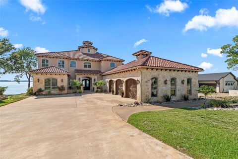 This stunning 2018 home, inspired by the timeless elegance of a Tuscan villa nestled in the foothills of Italy, offers 5,570 sq ft of refined waterfront living on a half-acre lot with 94 feet of open water frontage in the prestigious Pinnacle Golf Club at Cedar Creek Lake. Located in one of the most sought-after areas of the community, it's within walking distance to the clubhouse, restaurant, pool, and fitness centerand perfectly positioned next to the annual July 4 Pinnacle fireworks show for front-row lakeside views. Designed for both luxury and livability, the home features 5 bedrooms, 6 baths, 3 living areas, an office, exercise room, and a 3-car garage. A grand foyer welcomes you with a winding staircase, inlaid tile, chandelier, and sweeping lake views that instantly transport you to a Mediterranean retreat. The main living area is anchored by a stone fireplace and wet bar, flowing into a dining space with butlers pantry into a second spacious living area. The gourmet kitchen