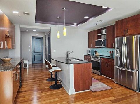 Luxury High-Rise Living in the Heart of DunwoodyExperience elevated living in this beautifully appointed 2-bedroom, 2-bath condominium located in one of Dunwoodys most desirable high-rise communities. This move-in-ready residence combines modern luxury with smart-home convenience and elegant design details throughout.Step inside to find a spacious, open-concept layout accented by gleaming hardwood floors and abundant natural light. The gourmet kitchen features custom cabinetry offering extra storage, premium stainless-steel LG appliances (including a 1-year-old washer, dryer, induction stove, dishwasher, and over-the-range microwave), and a professionally installed 11-stage alkaline reverse osmosis water filter integrated into the kitchen island a rare luxury for modern urban living.Both bedrooms feature custom-designed walk-in closets, and each of the two bathrooms offers an exceptional spa-like experience, complete with Sprite shower water filters for pure, refreshing water.