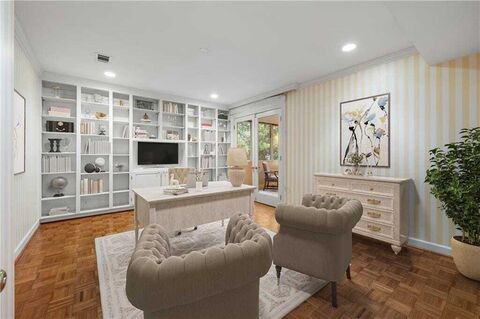 New Price! Motivated Seller. Unparalleled Opportunity in Prime Buckhead. Priced to accommodate your personal renovations and the largest condominium in the complex, this unit offers unbeatable value along Buckhead's coveted golden mile. The expansive open floorplan features 9' ceilings, hardwood floors, and a gas fireplace. The kitchen, dining area and fireside living room are open and accentuated by a large picture window with picturesque views of lush greenery and neighboring Tarrymore.This home boasts a wealth of custom storage options, including four walk-in closets, built-in floor to ceiling cabinets and shelving to showcase art or collectibles. The over sized primary suite offers his and her walk in-closets, bath with walk-in shower and double vanities, and a cozy sitting room leading to an enclosed porch. Guest bedroom with plentiful closets and full hall bath (convertible to en suite). A large separate den with built-in shelves and closet could serve as a third bedroom or hob