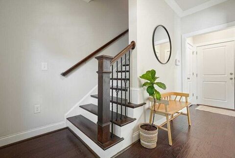 Step into modern exclusive living in the Encore Walk townhome community of Alpharetta. This three-level home offers the perfect mix of sophistication, functionality, and location. The terrace level offers a welcoming entry way, enhanced by a lovely staircase. Also included is a spacious bedroom and full bath, perfect for guests or office space. Additionally, the terrace level includes a spacious two-car garage. On the main level, soaring 10-foot ceilings create an open, airy atmosphere that flows through the living, dining, and kitchen spaces. The kitchen is thoughtfully appointed with a center island, white cabinetry, solid-surface counters, and an adjoining front porch perfect for growing your own herb garden or enjoying a morning cup of coffee. The spacious living area features a gas fireplace and leads to as expansive covered rear porch, ideal for relaxing outdoors and entertaining friends and family. A conveniently located half bath with recently upgraded vanity and new light fixt