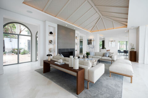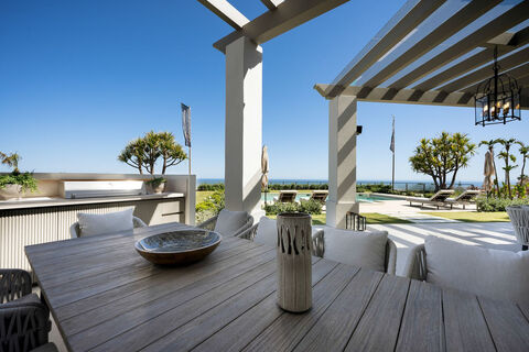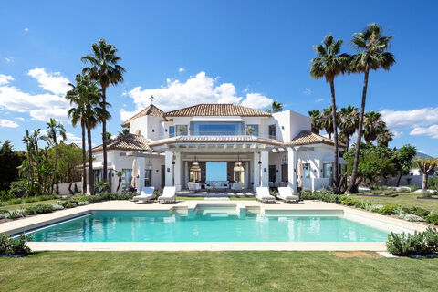 This stunning villa is located on the highest point of Monte Halcones, La Quinta and stands out for it's one-of-a-kind breath-taking views. You enter through an impressive Andalusian patio that leads to a bright entry hall with premium marble that goes through to a spacious naturally bright living room and a luxury Danespan open-plan kitchen perfect for entertaining. Large sliding doors from the living room make for a perfect indoor/outdoor living lead to the stunning terraces where you have beautiful seating areas, a barbeque kitchen, stunning modern swimming pool with amazing landscaped tropical gardens. On this level you also find a guest toilet, separate TV room, two en-suite guest bedrooms and a laundry room. An amazing spiral staircase takes you to the first floor where you encounter an elegant elevated office with stunning views, three en-suite guest bedrooms that are beautifully decorated and the impressive master en-suite which has a hamman style shower, enormous bath, spacious walk-in wardrobe and access to an amazing private terrace from where you can enjoy the breath-taking views. The basement includes a fully equipped gym, toilet and storage room. The villa also has a independent guest house with private access. This is a stunning property that must been seen to be fully appreciated.