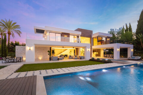 Fantastic front-line golf six bedroom contemporary villa in Las Brisas, Nueva Andalucia. This spectacular villa has a modern design with high quality finishings, an open plan layout and large rooms. The outdoor area is perfect for entertaining with a large infinity swimming pool, outdoor kitchen, landscaped gardens and sunny terraces with beautiful views over the golf course. The ground floor has a open plan concept with a large bright lounge dining area and luxurious fully fitted kitchen. On the first floor you find six en-suite bedrooms that access the terraces on this level that look over the gardens and golf course. The basement level is also considered the entertainment level with a state of the art Spa, indoor pool, sauna and Turkish bath, a fully fitted gym, cinema room, fully customised bar, poker table, wine bodega and pool table. This villa is truly one of a kind don“t hesitate to contact us to view!