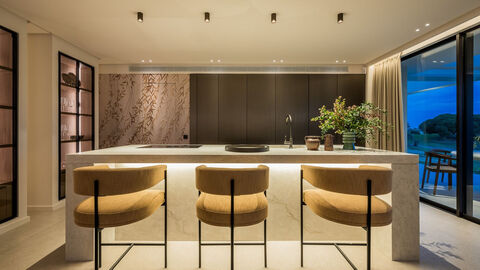 Stunning villa exceptionally designed in a prime frontline golf location, Nueva Andalucia, your ultimate destination for entertainment and golf enthusiasts. Upon entering, a sleek living space merges with an open-plan kitchen, offering captivating views of the renowned Los Naranjos golf course through floor-to-ceiling glass doors. This modern haven comprises four bedrooms, each with an en-suite bathroom and private terrace. The master bedroom boasts a spacious walk-in closet and an open-plan designer bathroom. Outside, a south-facing pool area and terrace provide sun-soaked moments and stunning golf course vistas. A golf buggy carport offers direct access to the fairways. The expansive roof terrace features an outdoor kitchen, seating, an outdoor cinema, and a luxurious DROP spa, all with breathtaking views of the golf course and valley. The basement houses a gym, home office, and laundry, offering convenience and practicality. The Villa epitomizes luxury living, combining contemporary design, entertainment, and a golf-centric lifestyle. Discover your dream home where every feature and detail has been meticulously crafted for your pleasure.