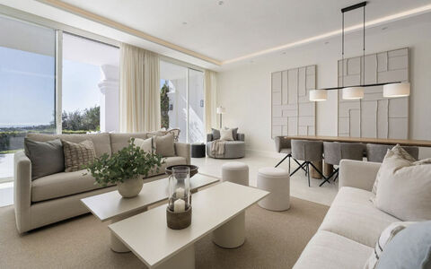Exquisitely Renovated Four Bedroom Townhouse | La Quinta, Benahavis This beautifully reformed townhouse is set within a sought-after community in La Quinta, Benahavis, showcases exceptional design, high ceilings, and panoramic views of the sea and mountains. As you enter, natural light floods through oversized sliding terrace doors, framing open vistas and creating a sense of space and elegance. The bespoke open-plan kitchen flows into a spacious living and dining area that extends seamlessly to a covered terrace and the landscaped communal gardens, all facing southeast to capture the morning sun and striking coastal scenery. The first floor hosts three bedrooms and three bathrooms, including a sophisticated master suite with a generous walk-in wardrobe, private terrace, and luxurious bathroom where the views take centre stage. The third floor is home to the fourth bedroom suite with access to two terraces, each offering breathtaking outlooks across the coastline and surrounding hills. The property has been completely rebuilt with high-quality materials and finishes. Every detail, from the interiors to the carefully selected colour palette, reflects refined taste while maintaining a warm and welcoming atmosphere. A magnificent townhouse in a prestigious location, this home combines timeless elegance, modern comfort, and a setting that perfectly captures the beauty of the Costa del Sol.