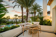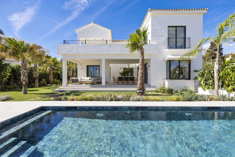 Refined Coastal Living with Striking Design | Estepona This beautifully crafted villa sits on a 1,054 m2 plot just five minutes from the heart of Estepona, offering the perfect blend of luxury, privacy, and nature. Surrounded by greenery yet close to top restaurants and amenities, it's a serene escape with unbeatable convenience. Inside, clean lines and minimalist elegance define the space, with five spacious bedrooms, five bathrooms, and high-end finishes throughout. Expect premium touches like AXOR fittings, Miele appliances, a Quooker tap, wine cooler, and underfloor heating in the bathrooms. Large-format Ceramica Mayor tiles flow seamlessly from the living room to the terrace and pool, while a sleek wood-burning stove adds a warm, stylish focal point. The landscaped garden is a true highlight, literally a tranquil haven with native plants, sea views framed by palms, natural stone paths, and ambient lighting for evening charm. The central pool is surrounded by lush greenery, and a smart parking setup adds the final touch to this effortlessly elegant home. A must-view for those seeking refined coastal living.