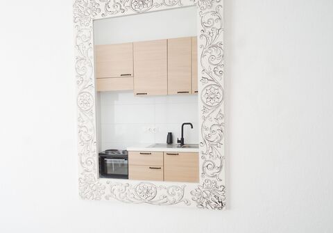 A spacious closet helps you keep your belongings organized. Together with the bathroom and its shower cabin, this simple yet urban apartment is designed to be both easy and practical for your stay