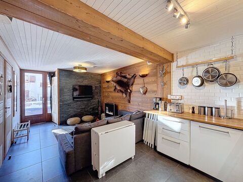 Handily situated on the ground floor of a block close to the centre of Les Gets village, this apartment benefits from a small terrace. It is sold with a parking space. Inside the flat there is a nicely renovated apartment with wooden walls consisting of a living room with a kitchen to one side, a bedroom, a bunk bed room, a bathroom and a WC.