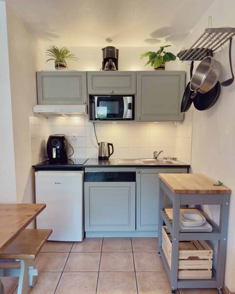 It has a total surface area of 48.48m2. It includes entrance hall with a sleeping alcove, open plan living room with kitchenette and access to the terrace and garden, 1 double bedroom, 1 bedroom with bunk beds, bathroom and separate WC.