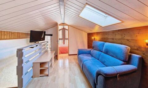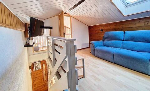 Built in 1986, the apartment has a total surface area of 65.59m2, 21.33m2 are below 1.8m in height. The accommodation includes: entrance hall, open plan living/dining/kitchen with equipped kitchen and access to the large south facing balcony, bathroom and separate WC. Stairs to upper level with 3 bedrooms (1 bedroom located on the main facade and 2 bedrooms located in a row at the rear of the building) plus a small living area.