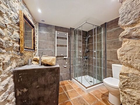 The ground floor consists of a magnificent double room with beautiful exposed stones and vaults, an exposed stone bathroom equipped with a shower and a magnificent marble basin.