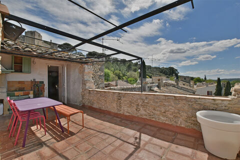 This village house has been beautifully renovated to let its old world charm shine. It has a large, bright living space of approx. 50m2 including living room with fireplace, kitchen with a nice view of the Vaunage and dining area. The next level has two bedrooms, one of about 23m2 with a closet and the other around 10.8m2, and a bathroom. On the top floor, there is an office space of about 10m2, a bedroom of about 11m2 and a bathroom. The rooftop terrace of about 22m2 offers a stunning view of the Vaunage and the castle. On the ground floor, there are two large cellars of 15 and 17m2 with beautiful vaulted ceilings, a laundry room, and a beautiful entrance of about 25m2 with exposed stonework. From original floors (bars de Montpellier or terracotta) to exposed stonework inside to the beautiful jointed facade; this lovely house is filled with character!