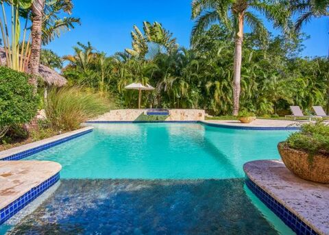 Outside the DR contemporary luxury villa are mature gardens and numerous exotic Palms. The well sized pool has a zero entry at one end and a very deep end with a separate spa pool and waterfall at the other. The Coral-stone pool terraces are cool to the touch in the heat with your feet. A thatch-roofed gazebo gives ocean glimpses and constant exposure to the ever-present trade winds. Behind the gazebo, a gate opens to a path that leads directly to the lovely beaches of Sea Horse Ranch.