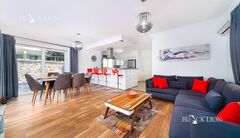 Open plan ground floor living area with two sets of French doors to the sun terrace