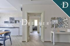 This is the largest property and is laid out on the ground floor. There is a living room with a mezzanine, kitchen, exit to the loggia, two bathrooms, and two double bedrooms.
