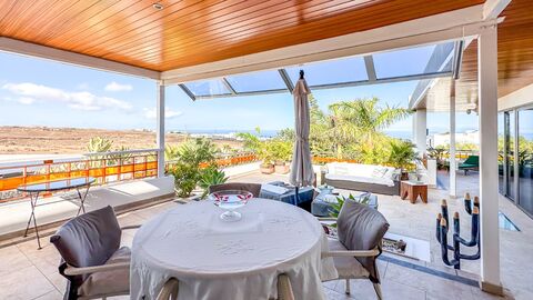 This exceptional and unique property in a private location in the quiet village of Las Brenas offers complete luxury and privacy including breathtaking panoramic views. This is the ideal investment property, this estate consists of 3 self-contained 1-bedroom-apartments, 2 pools, and a main villa, which is accessed via a private driveway and boasts individual architectural design. One of the many highlights of this property is a car turntable in front of the main entrance. The villa is equipped with a security system and is accessed using a fingerprint scanner. The interior has been tastefully furnished and decorated to a high standard, with a luxurious lounge complete with a fireplace and elevated dining area offering panoramic views of the scenery fro all areas of the villa. The hall flows through to the modern, fully equipped kitchen and the large rear garden and terrace with alfresco dining and BBQ area. The main bedroom with natural wooden floor, walk in wardrobe and ensuite bathroom opens up to the private balcony with a private heated pool. There also is a second bedroom which is currently used as office, and a guest WC. Another highlight is the villa's rooftop terrace with a cosy chill out area perfect for star gazing and relaxing. The 3 1-bedroom-apartments all have separate entrances and a private terrace each, with access to the solar heated 8x4 pool with waterfall feature. Other luxurious highlights of the property include a personal wine bodega perfect for entertaining, private parking for up to 4 cars, imported tiles, insulated walls, high quality materials used throughout the property, and much more. The village of Las Brenas is located in the southwest of Lanzarote and offers privileged sea views and breathtaking sunsets over the salt flats of Janubio and the Timanfaya National Park. A luxurious property in a privileged location surrounded by an unique landscape.