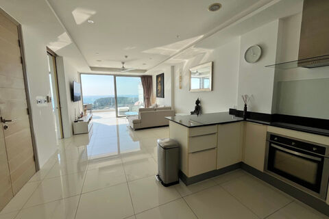 The condo offers a 124 sqm built-up area and a west-facing orientation, capturing sunset views over Kata. Sea views can be enjoyed from the bedroom, living area, and kitchen, as well as from the private balcony. The balcony also features a generously sized outdoor jacuzzi.