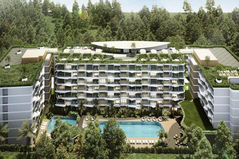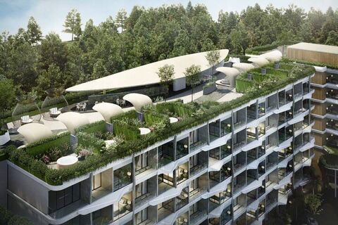 These 1-bedroom condos for sale, just 5 minutes' drive to Nai Harn Beach, Phuket, feature clean geometric lines and glass-fronted balconies that invite natural light and open to sweeping views. Vertical and horizontal forms create a refined visual balance. The greenery softens the facade, framing each level and connecting the structure to its tropical surroundings. At its centre stands a sculpted canopy supported by tree-like pillars. This distinctive feature anchors the design to its lush hillside setting.