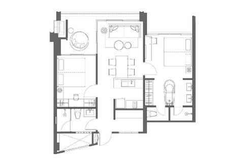 The 80 sqm layout is designed for both privacy and comfort. The open-plan living, dining, and kitchen area sits at the heart of the home, creating a natural sense of flow. Each bedroom is positioned at opposite ends of the unit, offering privacy for couples, families, or long-stay guests.