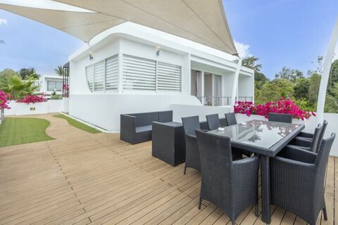 Positioned on a generously sized plot of 542 sqm, the ground floor opens directly to the pool deck, where daybeds and loungers surround the pool. A small lawn garden nearby is perfect for children.