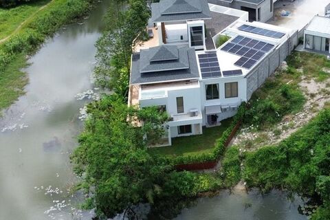 A modern-tropical smart home with solar panels, this villa blends contemporary living with eco-friendly design, set in a quiet residential enclave near Ban Bang Niew Dam and surrounded by mountain scenery.