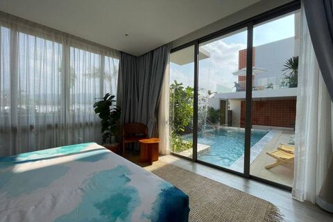 This fully furnished pool villa features an open-plan living and dining area with double-height ceilings and glass walls, creating a bright and airy family hub that connects directly to the pool terrace.