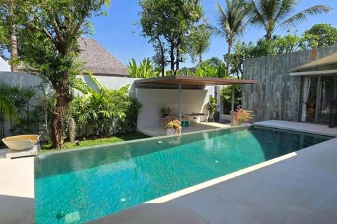 Ownership is Leasehold (3×30 years, renewable) with an option to acquire freehold. It is part of a gated development of 42 modern Balinese-style 2-4 bedroom pool villas, completed in 2019.