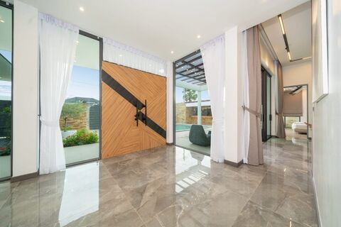 A skillful combination of indoor and outdoor areas results in seamlessly integrated patios and gardens. Expansive glass doors flood interiors with natural light and accordingly extend your living area beyond the walls. Clean lines and a mix of materials and textures in a monochromatic tone, provide visual interest and a distinctly modern edge. The interior spaces of the villa exude simple elegance, as a result of the use of sleek furnishings, clean lines, and the tasteful use of wood.