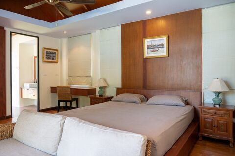 This 4 bedroom resort-style pool villa for sale in Pa Klok, Phuket features a large swimming pool that runs the length of the main villa, and pavilions arranged on landscaped grounds of 1,550 sqm. This property is a sprawling 643 sqm of built-up area and all 4 bedrooms have ensuite bathrooms, vaulted ceilings, and hardwood floors. There is also a dedicated office and a guest toilet.
