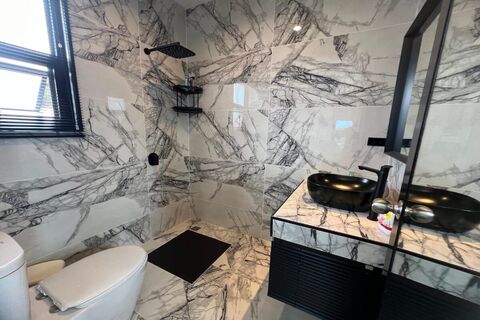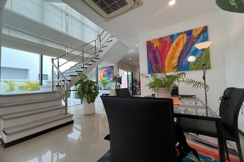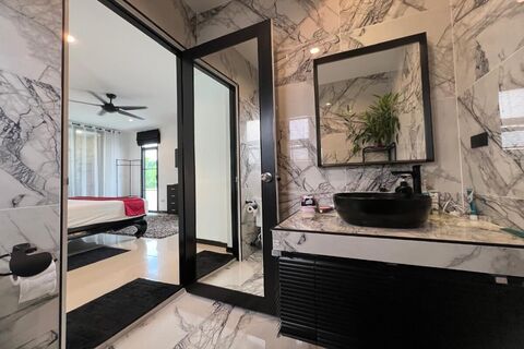This 3 bedroom modern & stylish pool villa for sale with partial views of the sea in Rawai, Phuket was recently renovated in 2023. Renovation works include complete repainting of the interior and exterior, retiling of bathrooms and swimming pool, and installing a fully-fitted and kitted Western kitchen complete with dishwasher.