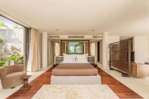 The living room boasting a stunning view of the ocean, is lined with grand white pillars and features a sky high ceiling. A glass-topped dining table that can seat up to 10 people is located in the indoor dining room. The covered sala outdoors, where you can enjoy spotless views of the Andaman Sea, offers the most picturesque dining experience.