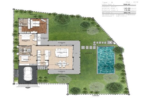 Set inside an 8-rai (12,800 sqm) exclusive and serene sanctuary, this project features 20 modern tropical pool villas with 4 floorplans to choose from. Build-up areas range from 266.39 - 273.64 sqm with spacious land plots starting from 413.14 sqm up to large plots of 916.32 sqm.