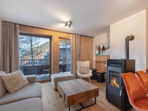 A bright, open-plan living room with wood stove sets the scene for cosy winter evenings, while the stylish, fully equipped kitchen connects seamlessly to the dining area and balcony — perfect for enjoying the late afternoon sun and sweeping mountain views. The bathroom features high-quality finishes and a walk-in shower, complemented by a separate toilet for added ease.
